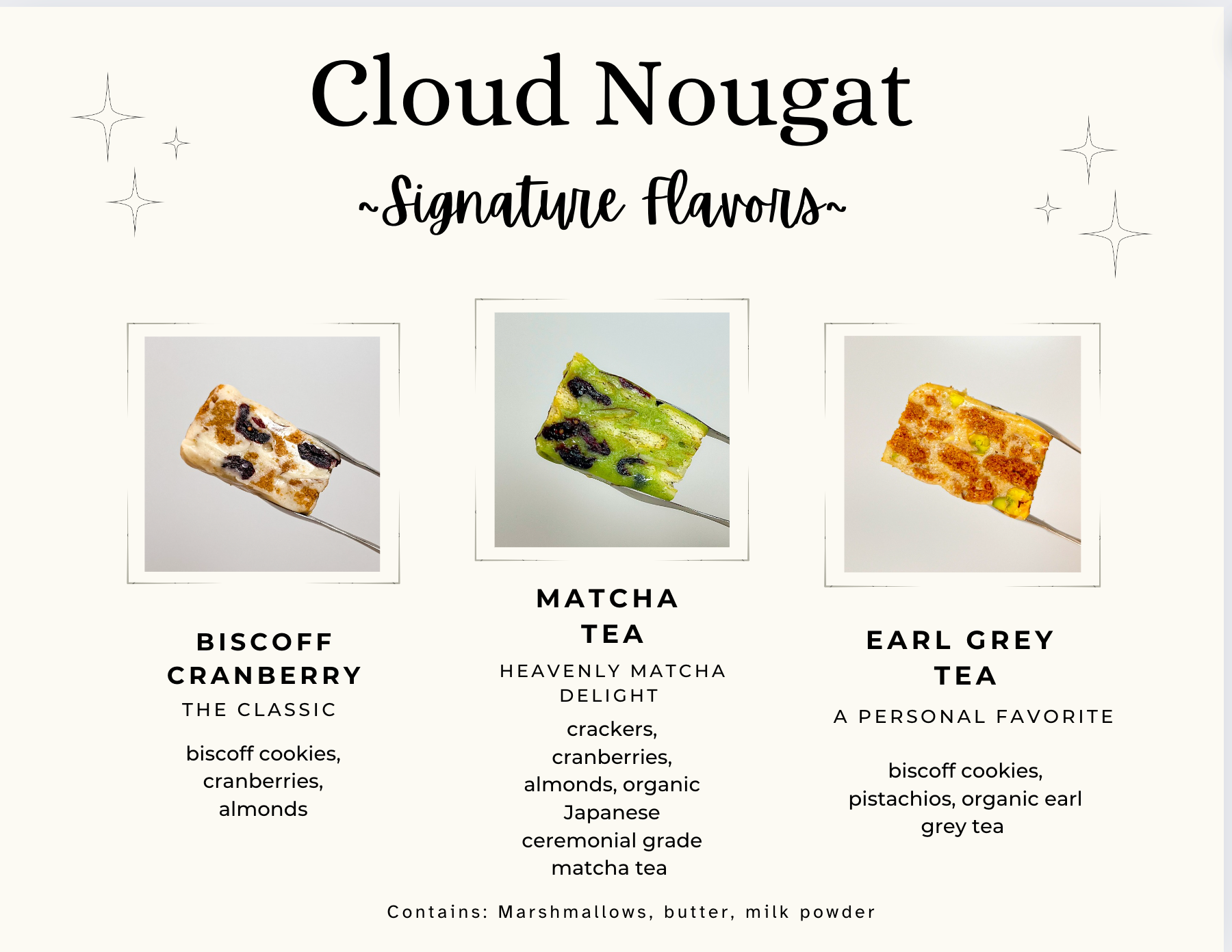 A cloud nougat is our unique twist to Asia's snowflake crisp-a delightful blend of cookie and nougat. These milky confections are soft with an added chewy crunch. Lightly sweetened and loaded with organic tea, nuts, dried fruit, crackers, they offer a healthier indulgence. Best of all, they won't stick to your teeth!